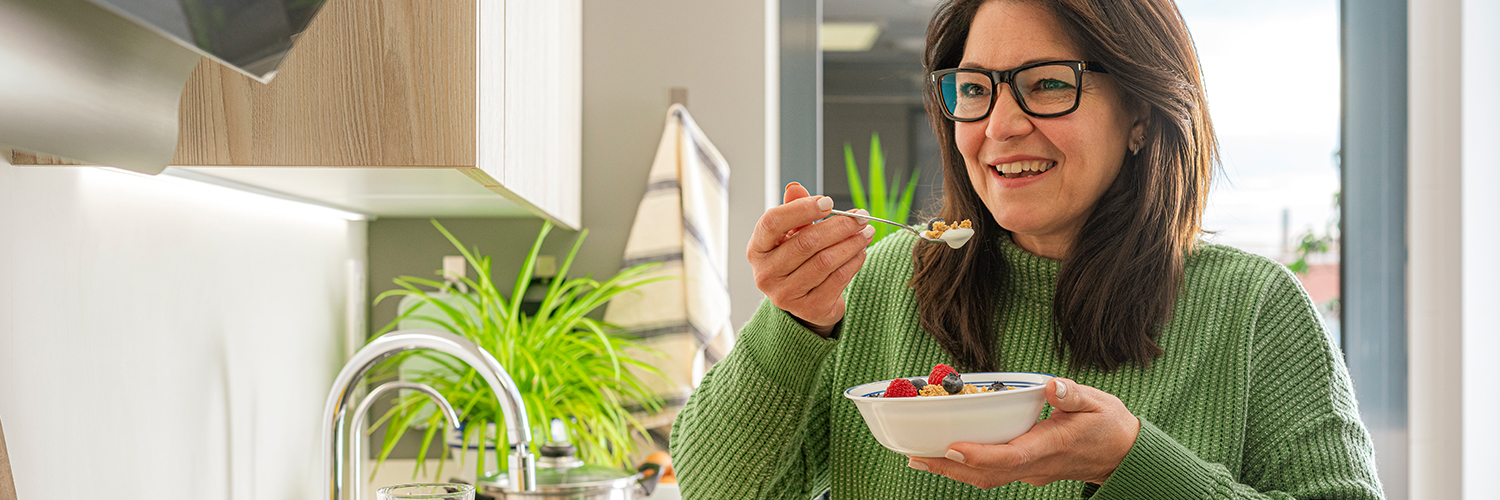 A woman standing in her kitchen, eating a healthy breakfast while smiling.